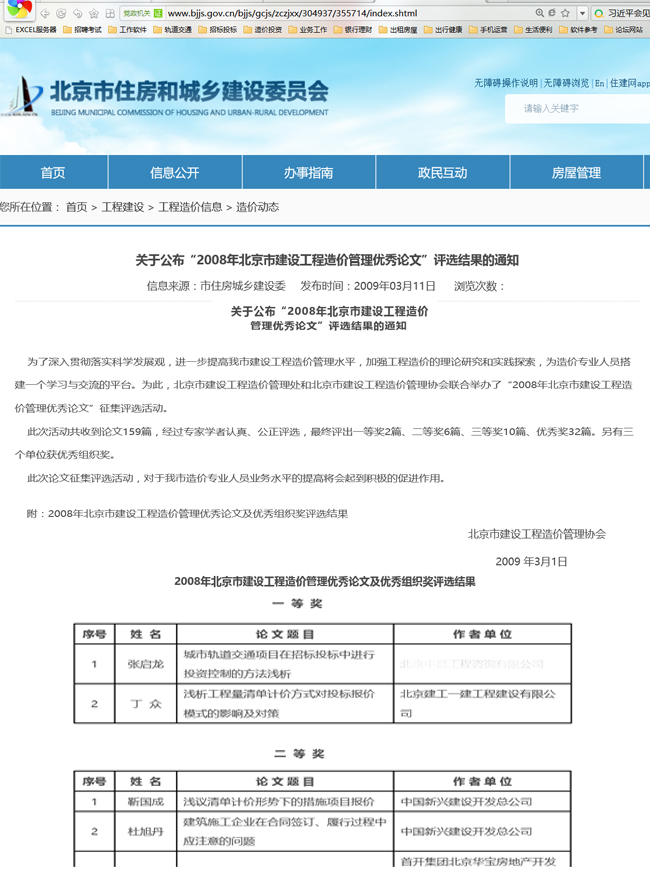 为了深入贯彻落实科学发展观,进一步提高我市建设工程造价管理水平,加强工程造价的理论研究和实践探索,为造价专业人员搭建一个学习与交流的平台。为此,北京市建设工程造价管理处和北京市建设工程造价管理协会联合举办了“2008年北京市建设工程造价管理优秀论文”征集评选活动。