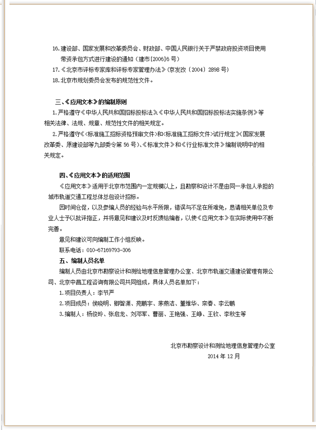 北京市标准设计招标文件应用文本(轨道)编写人员2014